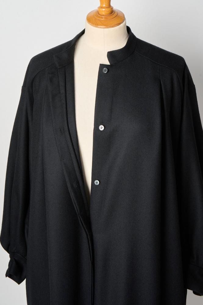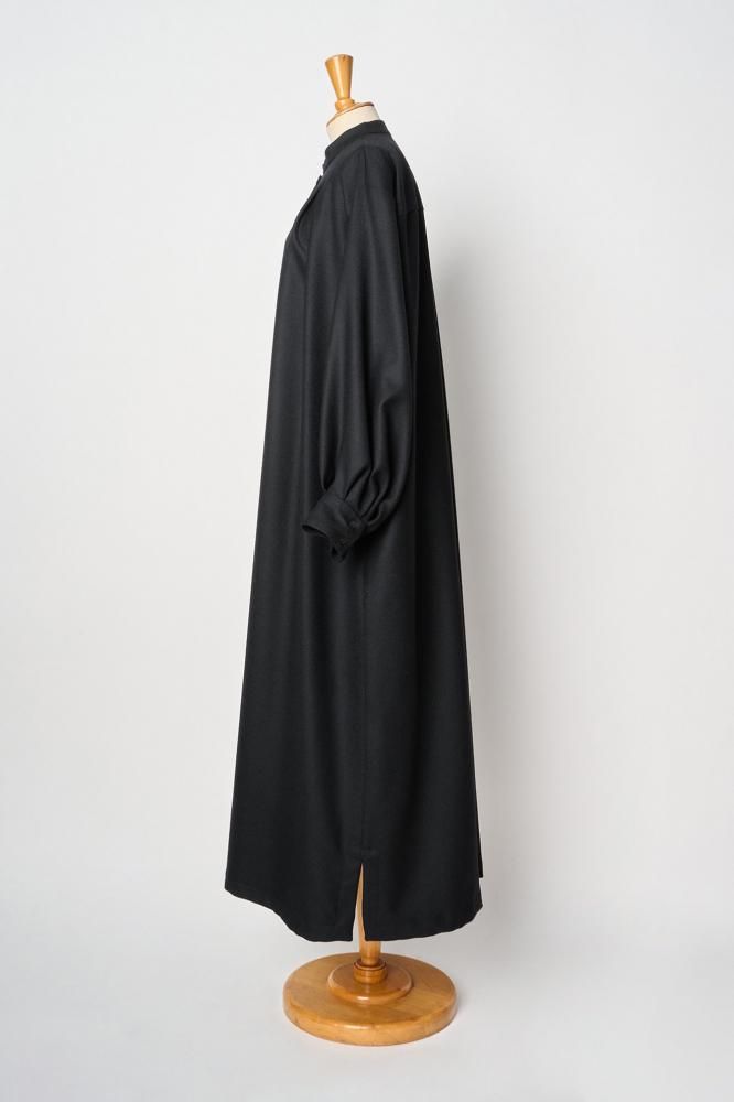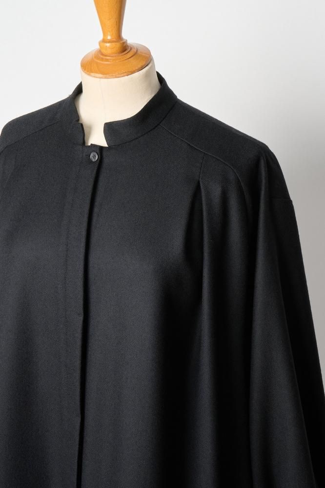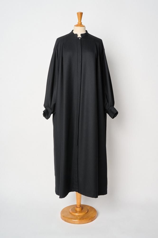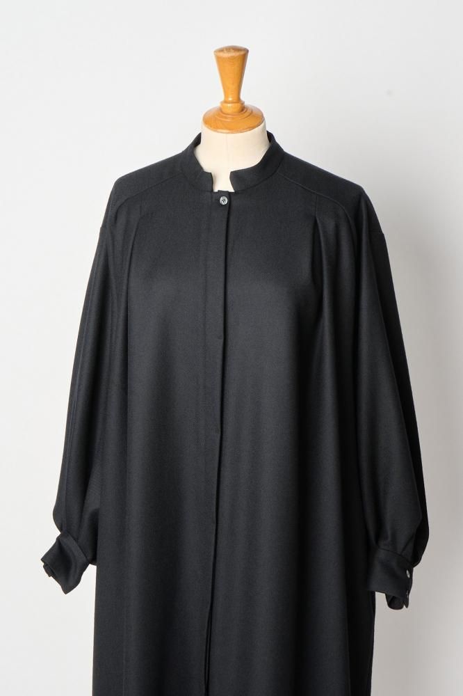 SINMEが得意なAラインのワンピース、今シーズンはチャイニーズ風のマオカラーです。なんと前を開けてAラインのコートとして活用できます。ラグラン袖、ふっくらした袖丈、胸上にボックスプリーツなど、ゆったりとした着心地。ウール素材らしい、しなやかなドレープ(裏地なし)。両サイドにポケットが付いています。これ一枚あればいろんな場面で活躍してくれるコンビニエントな逸品です。