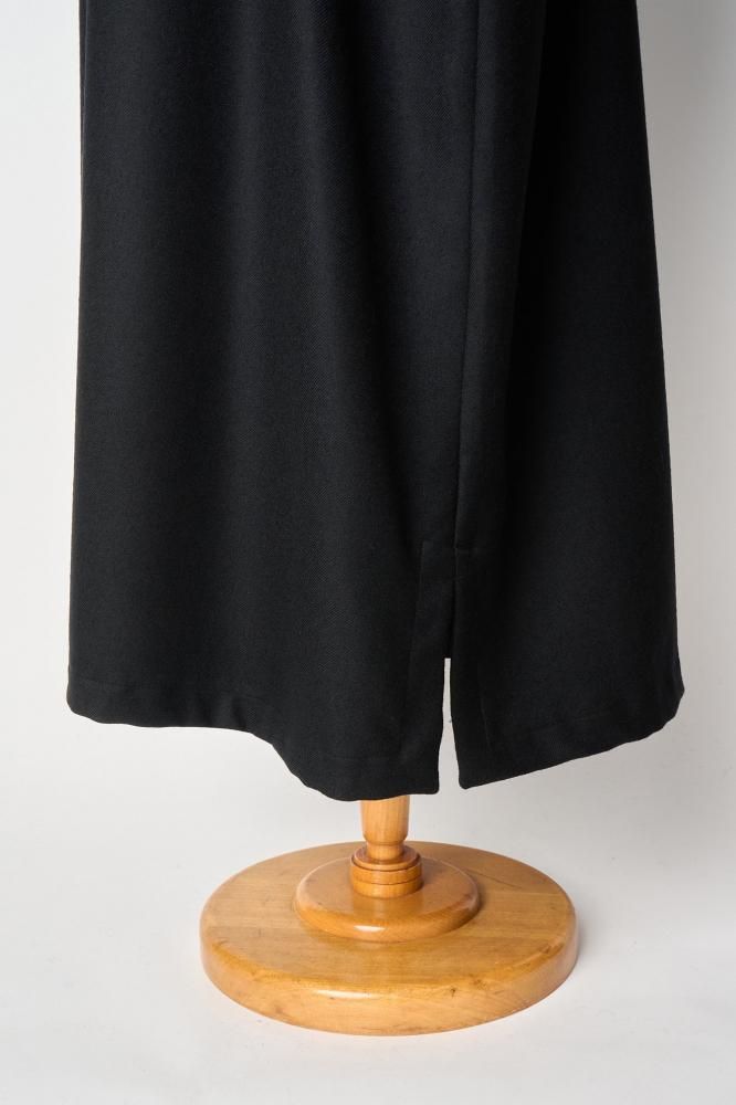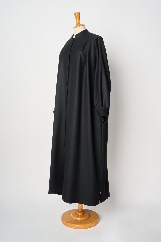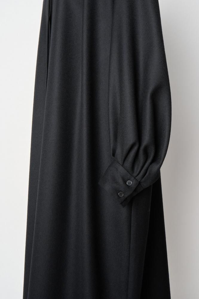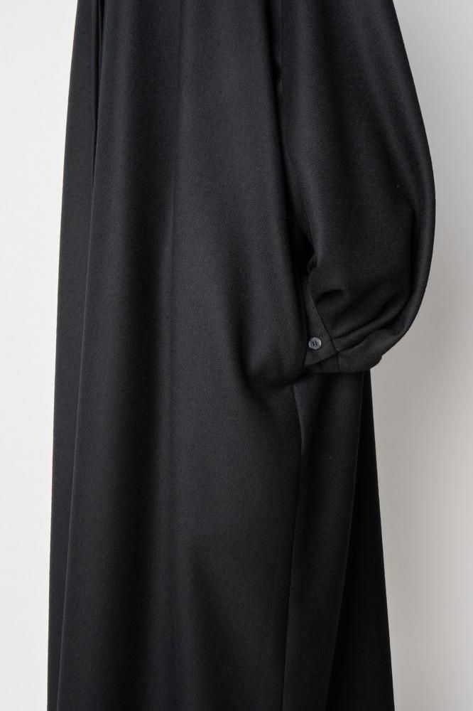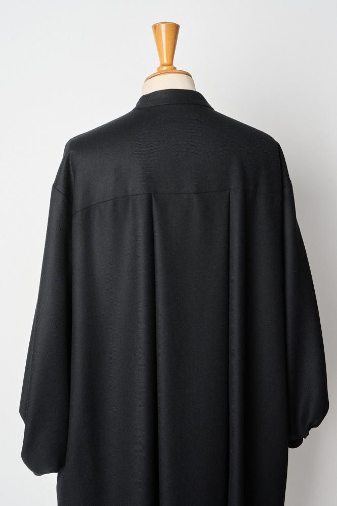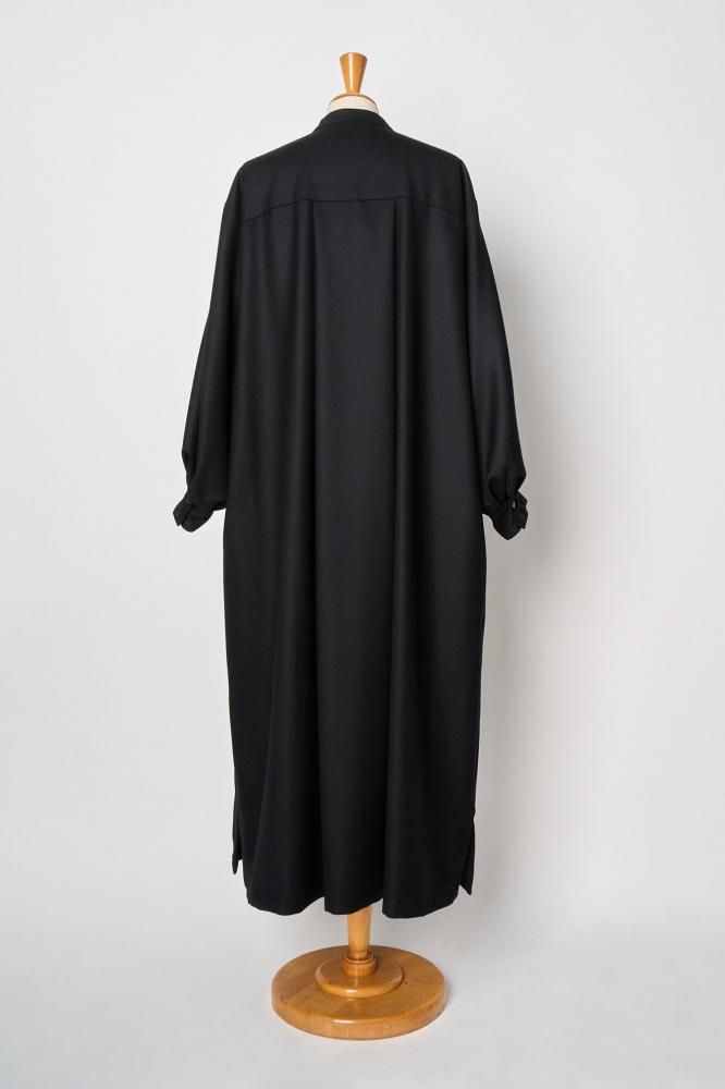 SINMEが得意なAラインのワンピース、今シーズンはチャイニーズ風のマオカラーです。なんと前を開けてAラインのコートとして活用できます。ラグラン袖、ふっくらした袖丈、胸上にボックスプリーツなど、ゆったりとした着心地。ウール素材らしい、しなやかなドレープ(裏地なし)。両サイドにポケットが付いています。これ一枚あればいろんな場面で活躍してくれるコンビニエントな逸品です。