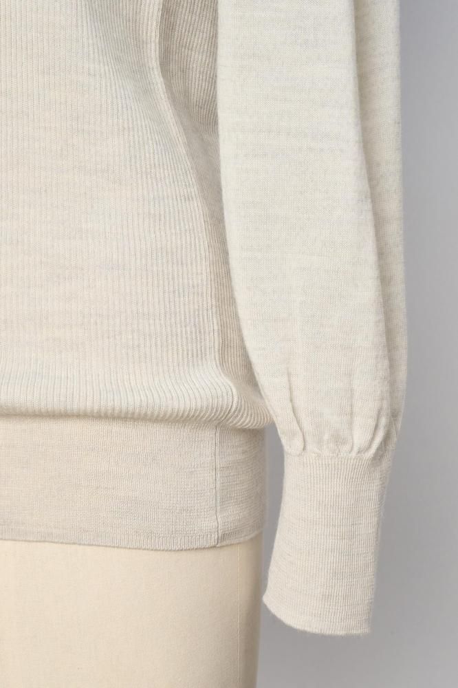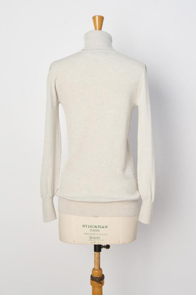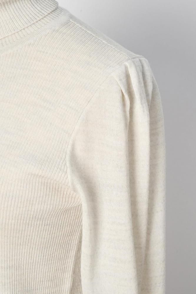SINMEの人気定番リブタートルネックセーター。やや高いネック、パフスリーブ、伸縮性のあるウール生地。着心地を考慮してボディとスリーブで編み目のテンションを変えているのが特徴です。