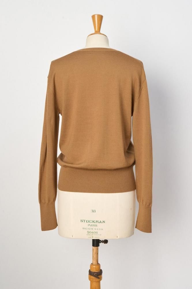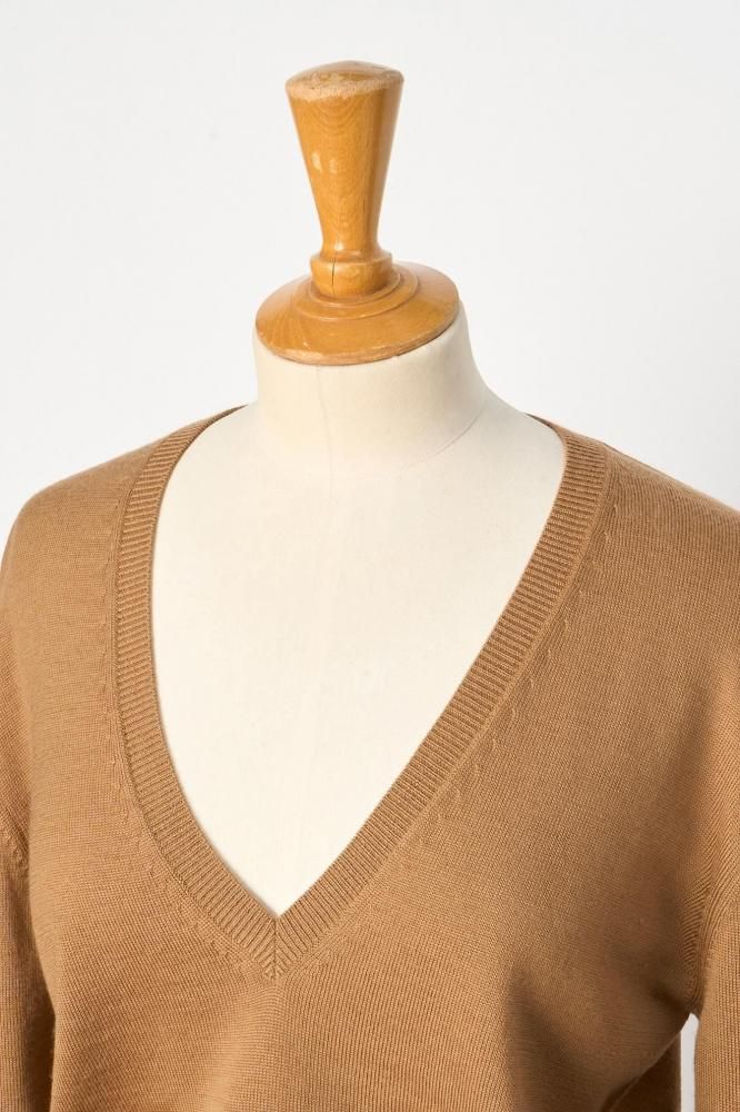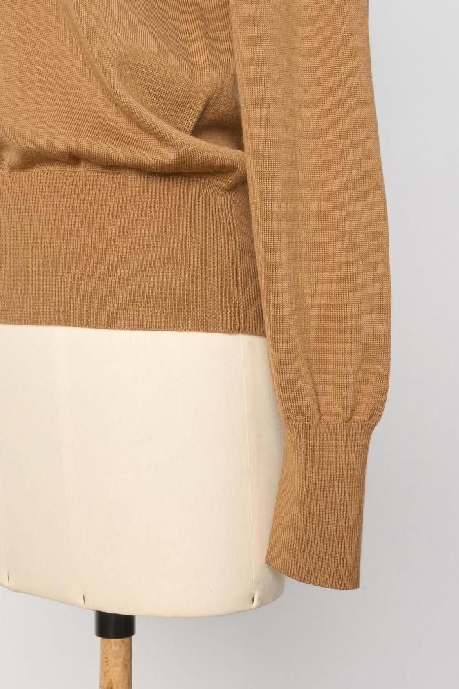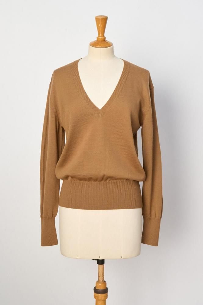 ディレクター板谷のこだわりを詰め込んだ Vネックニットができました。深く細長いシャープなVゾーンを作るため、出来る限り襟ぐりを狭めにして袖口と裾のリブも長めにすることでボトムコーディネートした際にバランスが作りやすいように仕上げました。深さはありますが、着用した時には少し後ろに抜けるので下着が見えないように心掛けました。使用した糸とゲージはSINME冬の定番タートルニットと同じものになり、肌馴染みと着心地には定評があります。アクセサリーと合わせるなど、ご自身の個性を引き出してくれる一枚になると思います。ご自宅でケアのできるニットです。