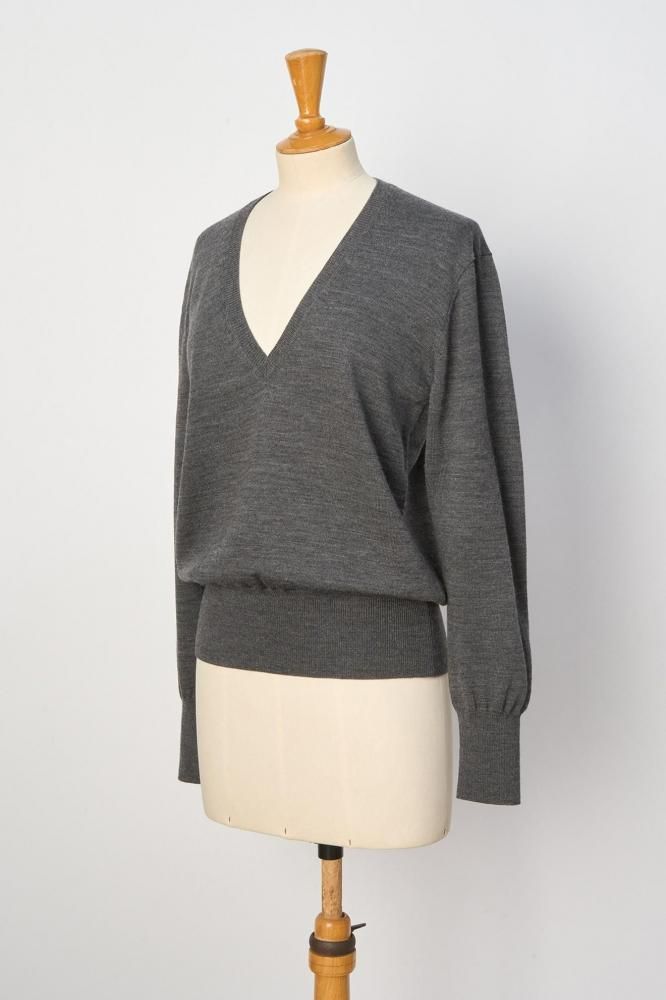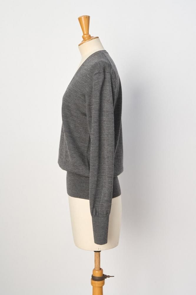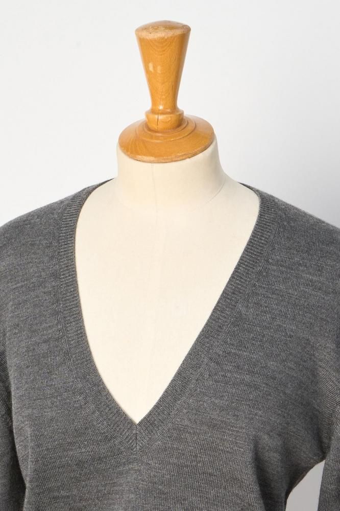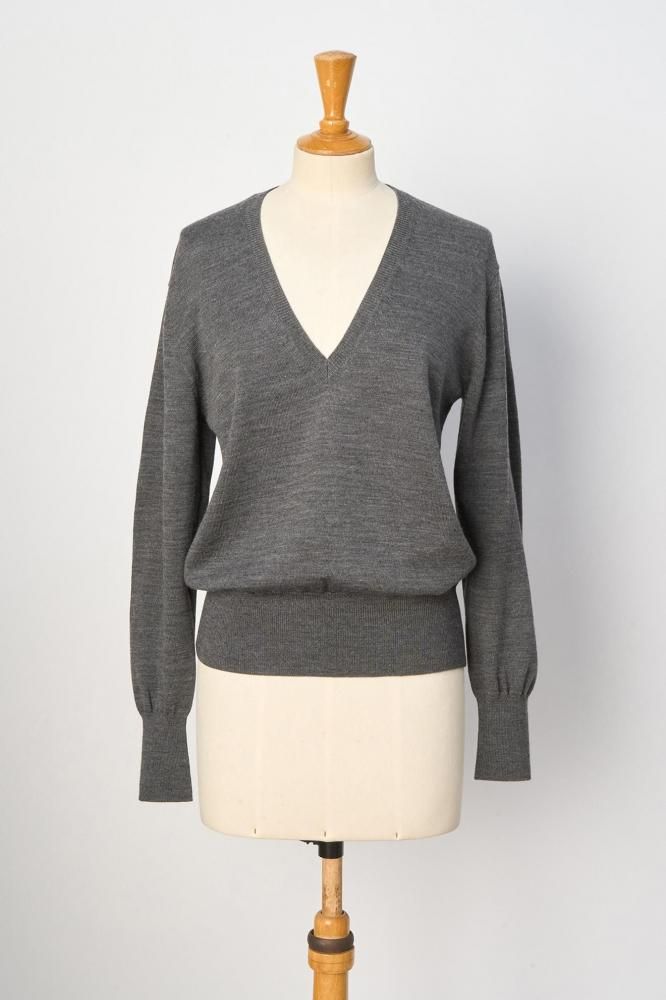 ディレクター板谷のこだわりを詰め込んだ Vネックニットができました。深く細長いシャープなVゾーンを作るため、出来る限り襟ぐりを狭めにして袖口と裾のリブも長めにすることでボトムコーディネートした際にバランスが作りやすいように仕上げました。深さはありますが、着用した時には少し後ろに抜けるので下着が見えないように心掛けました。使用した糸とゲージはSINME冬の定番タートルニットと同じものになり、肌馴染みと着心地には定評があります。アクセサリーと合わせるなど、ご自身の個性を引き出してくれる一枚になると思います。ご自宅でケアのできるニットです。