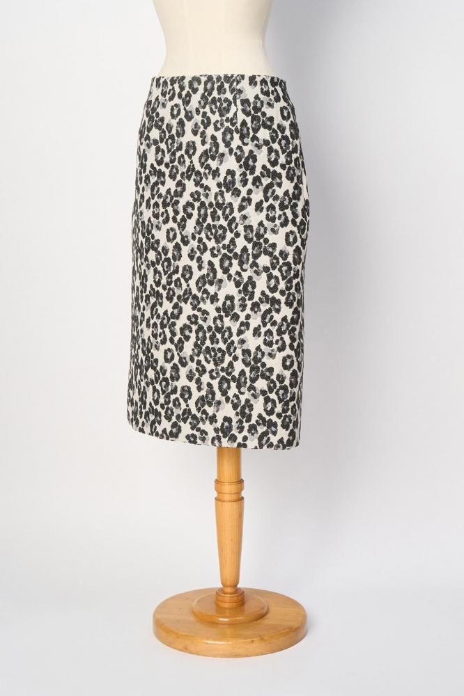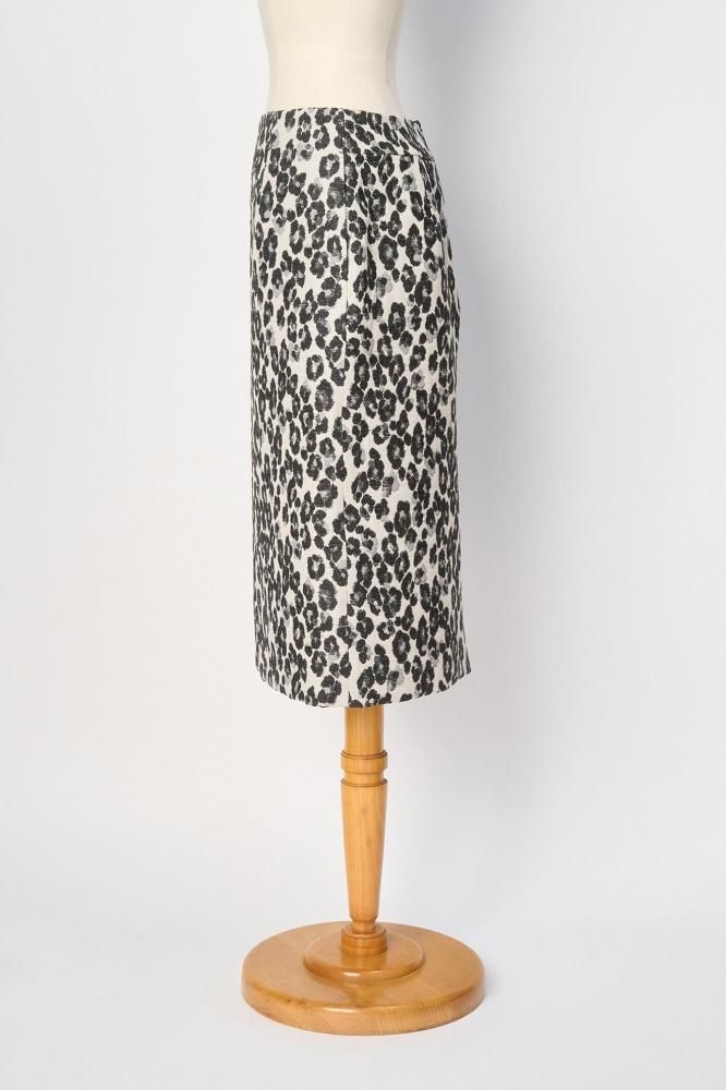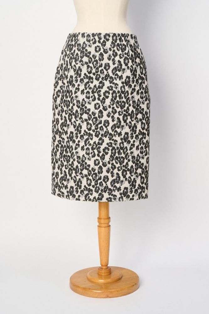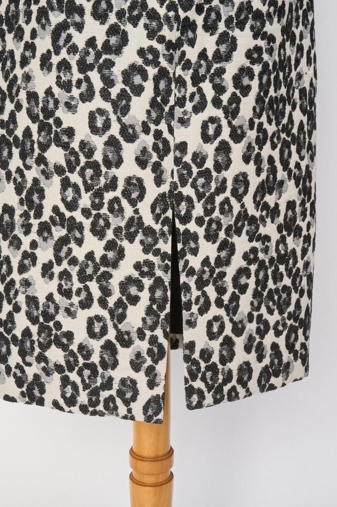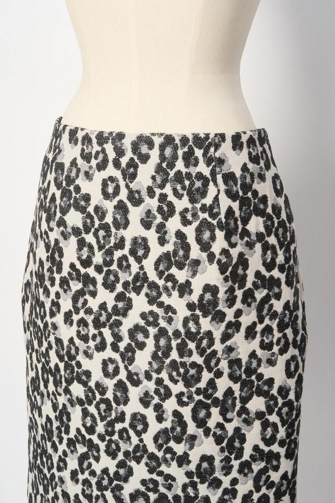 花柄にも見えるレオパードの織り柄生地を使ったスカート。タイトめのシルエットでバックにスリットが入っています。オンでもオフでも活躍してくれます。両ポケット、総裏がついています。